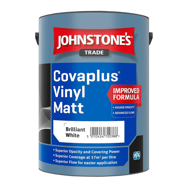 Johnstone's Trade Covaplus Vinyl Matt is a high-quality matt emulsion, suitable for all interior walls and ceilings, providing excellent opacity, coverage and application. Ideal for use on wood, metal and plaster as well as wallboards, concrete, cement rendering, brickwork and blockwork in internal situations. Johnstone's Trade Covaplus Vinyl Matt will cover approximately 12-14 square metres per litre, depending on the nature and porosity of the surface being painted, and is touch dry in 1-2 hours and recoatable after 2-4 hours.