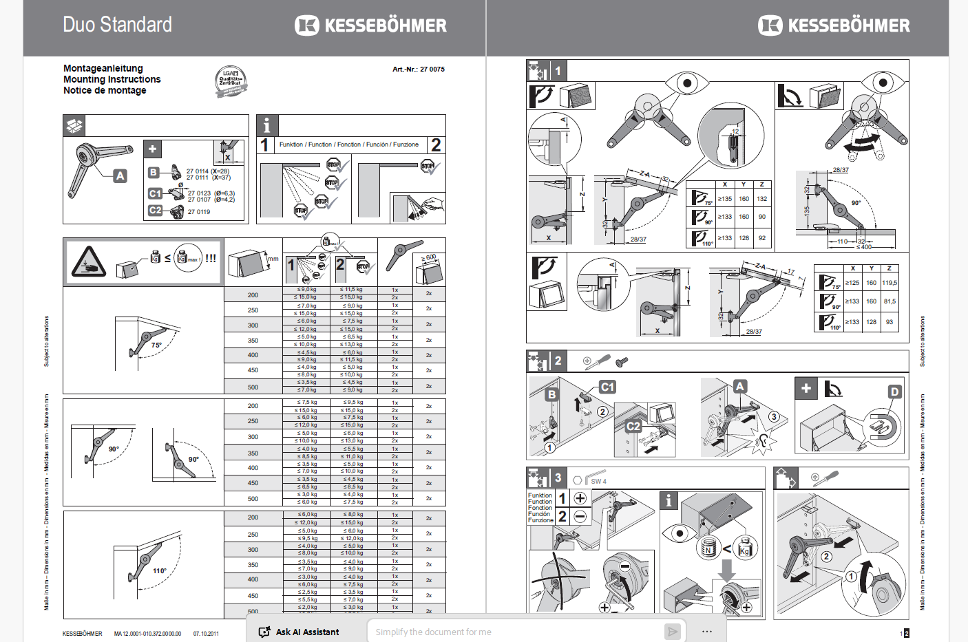 Lift-up mechanism for both lift-up and drop-down doors. The support works based on a friction clutch, rather than a spring mechanism. Therefore, the doors need to be opened to the desired position, and they will stay in that position. The set includes a door bracket and a cabinet bracket. The DUO scissor flip-up system can be used for either folding or flip-up doors. The change is made simply by rotating the arms by more than 180°. The braking force can be adjusted using an hex screw located at the center of the arm rotation, according to the size and weight of the doors.